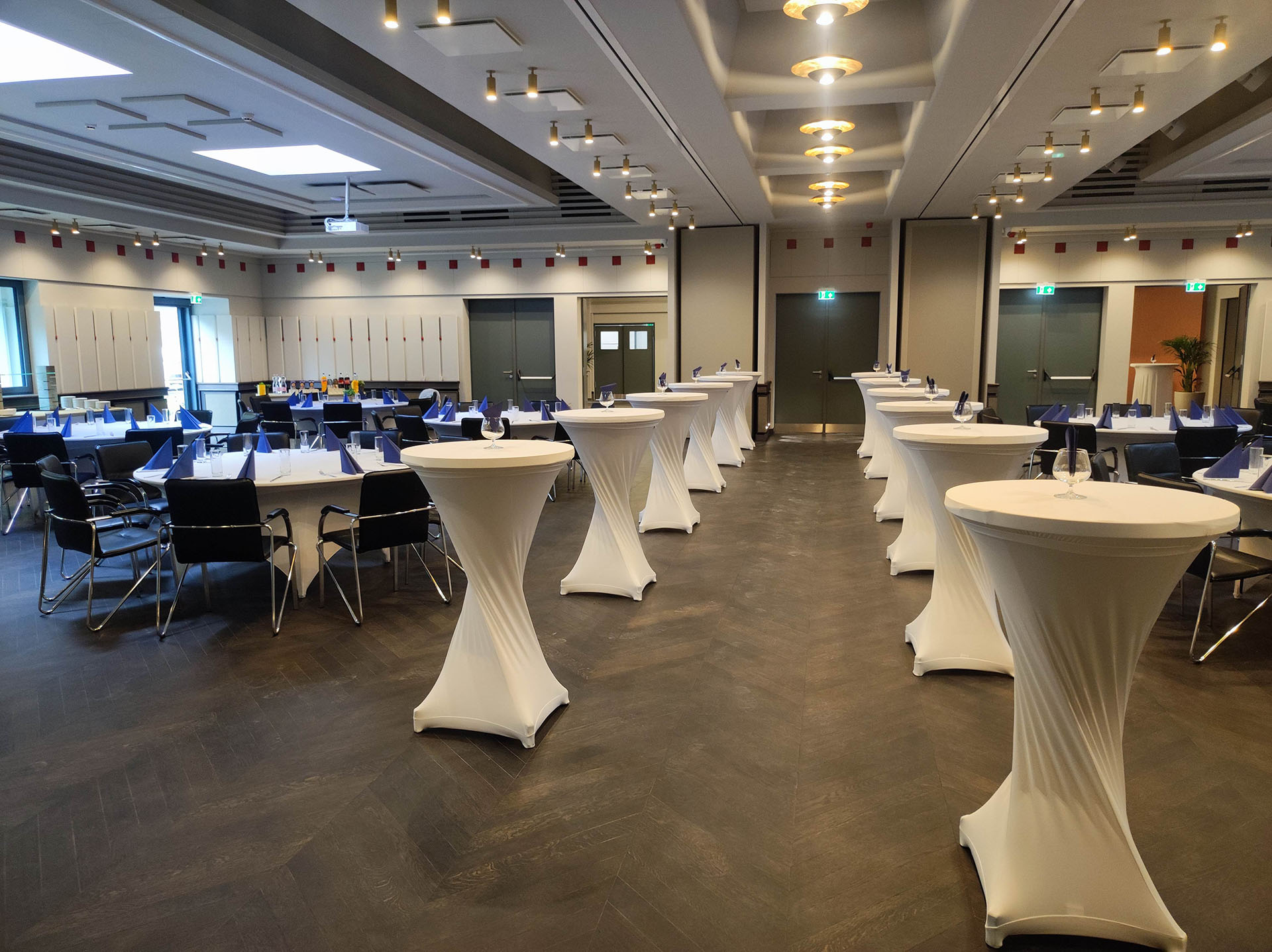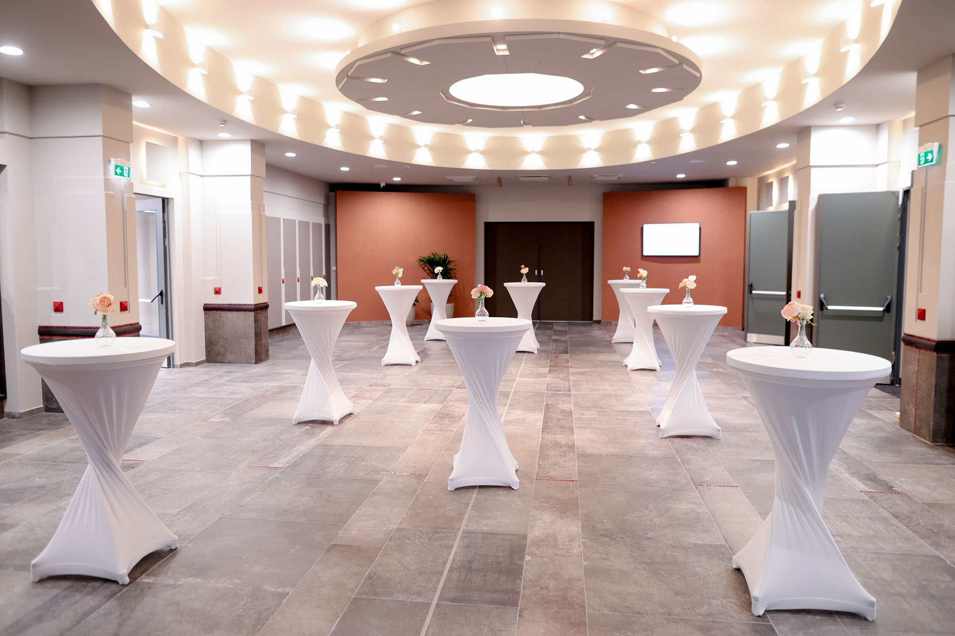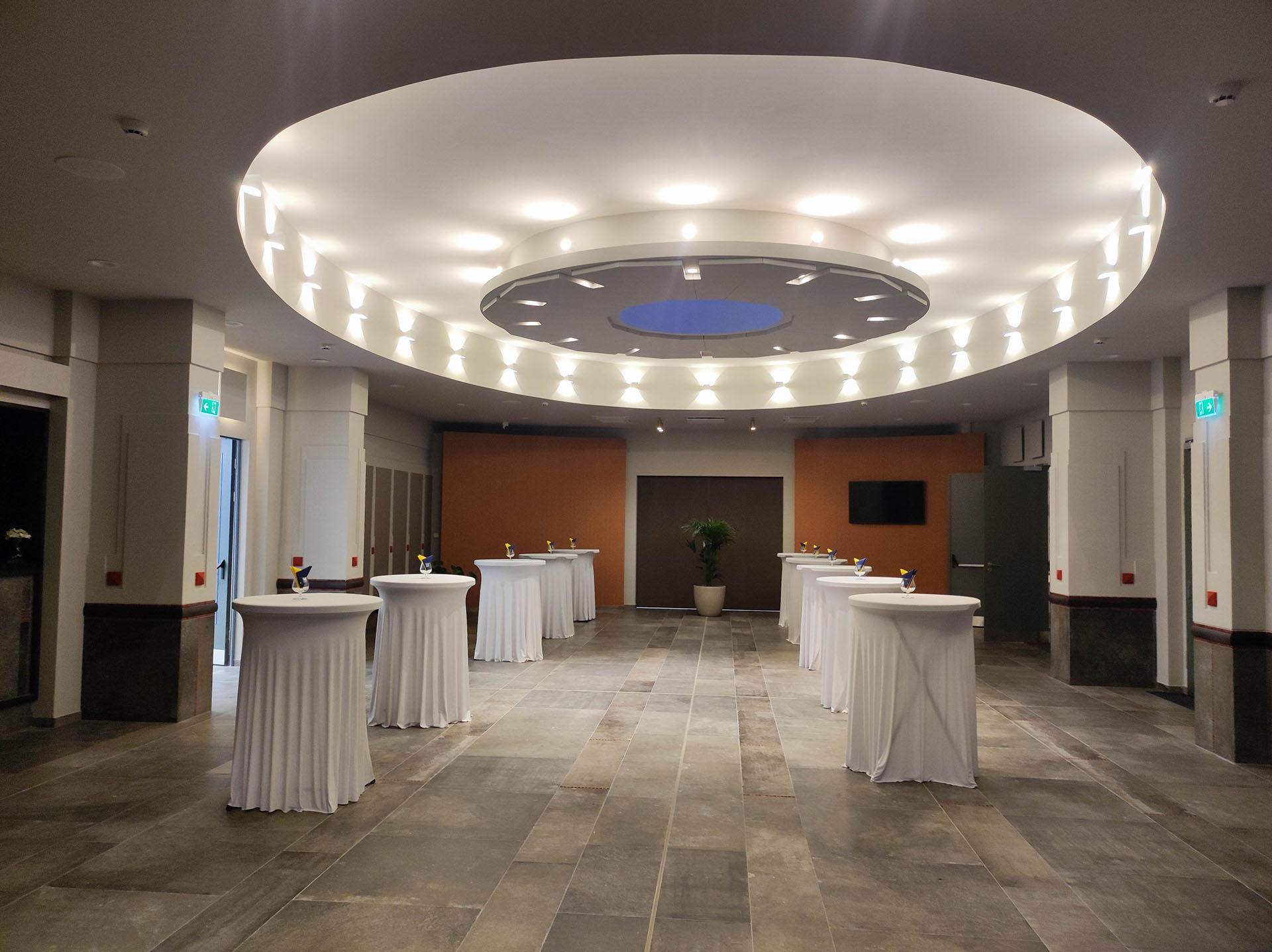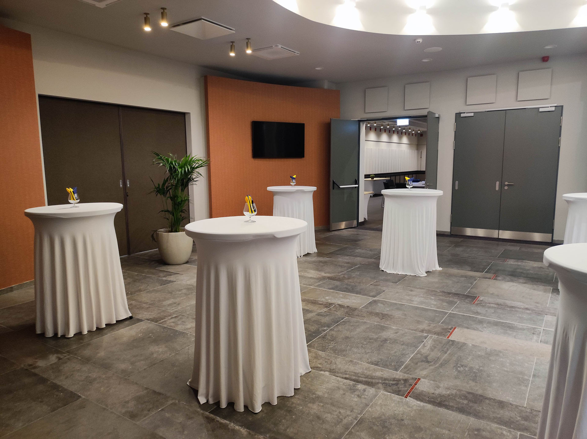 The hall is accessed through a spacious, 136 sqm foyer featuring an elegant cloakroom and a stylish bar area, providing a welcoming atmosphere for arriving guests. The main space benefits from ample natural daylight and can be flexibly divided into two highly soundproofed sections of 150 m² each. One section can be further extended by an additional 40 m², allowing the layout to adapt seamlessly to various event formats.