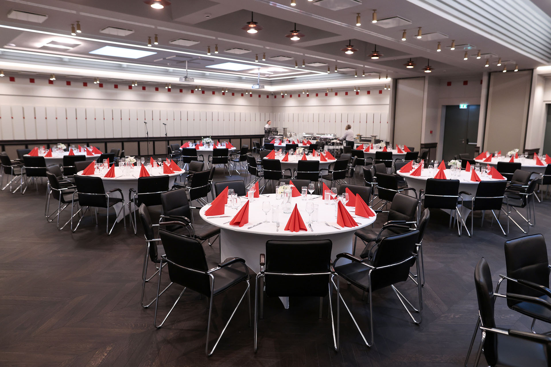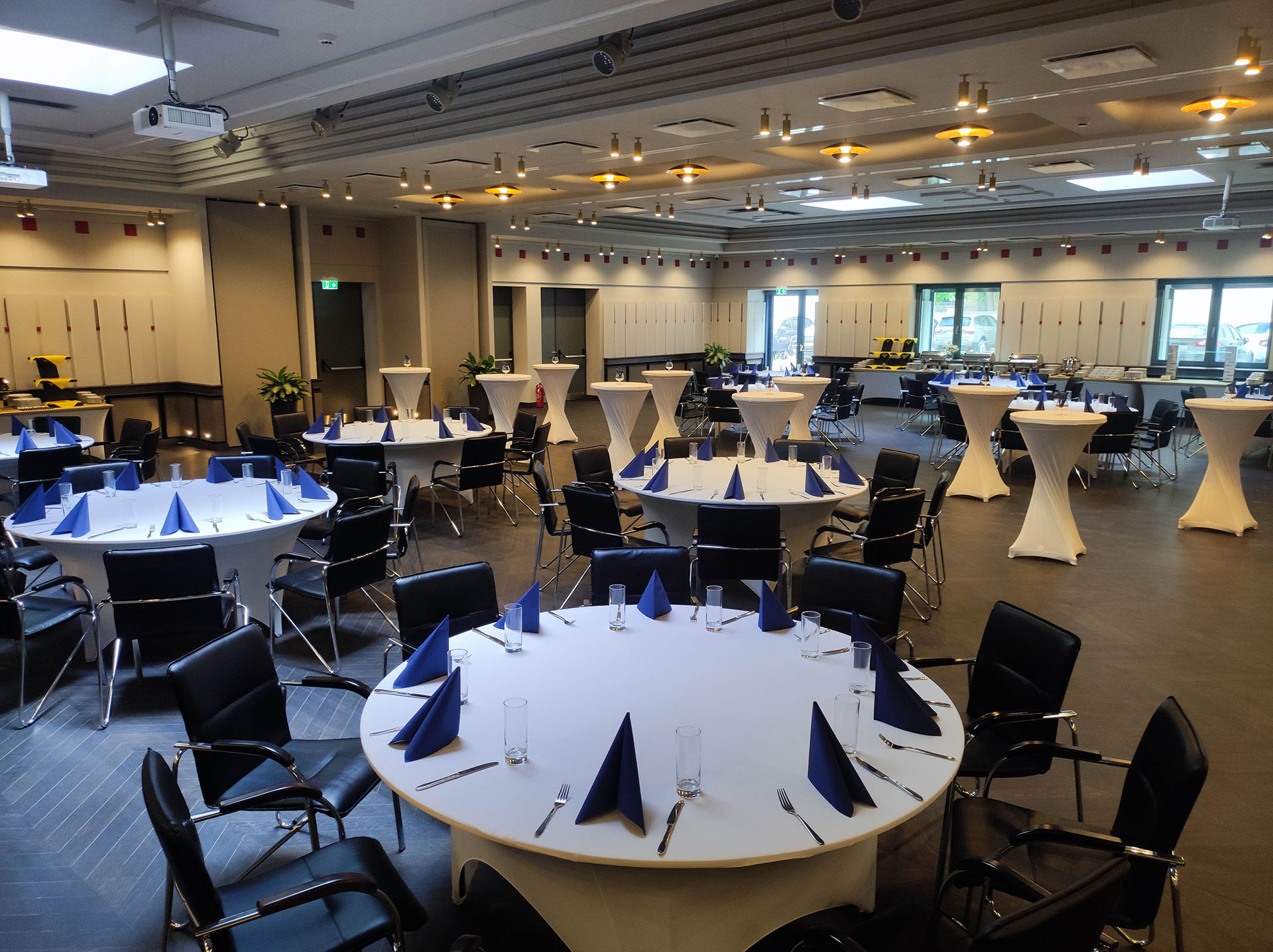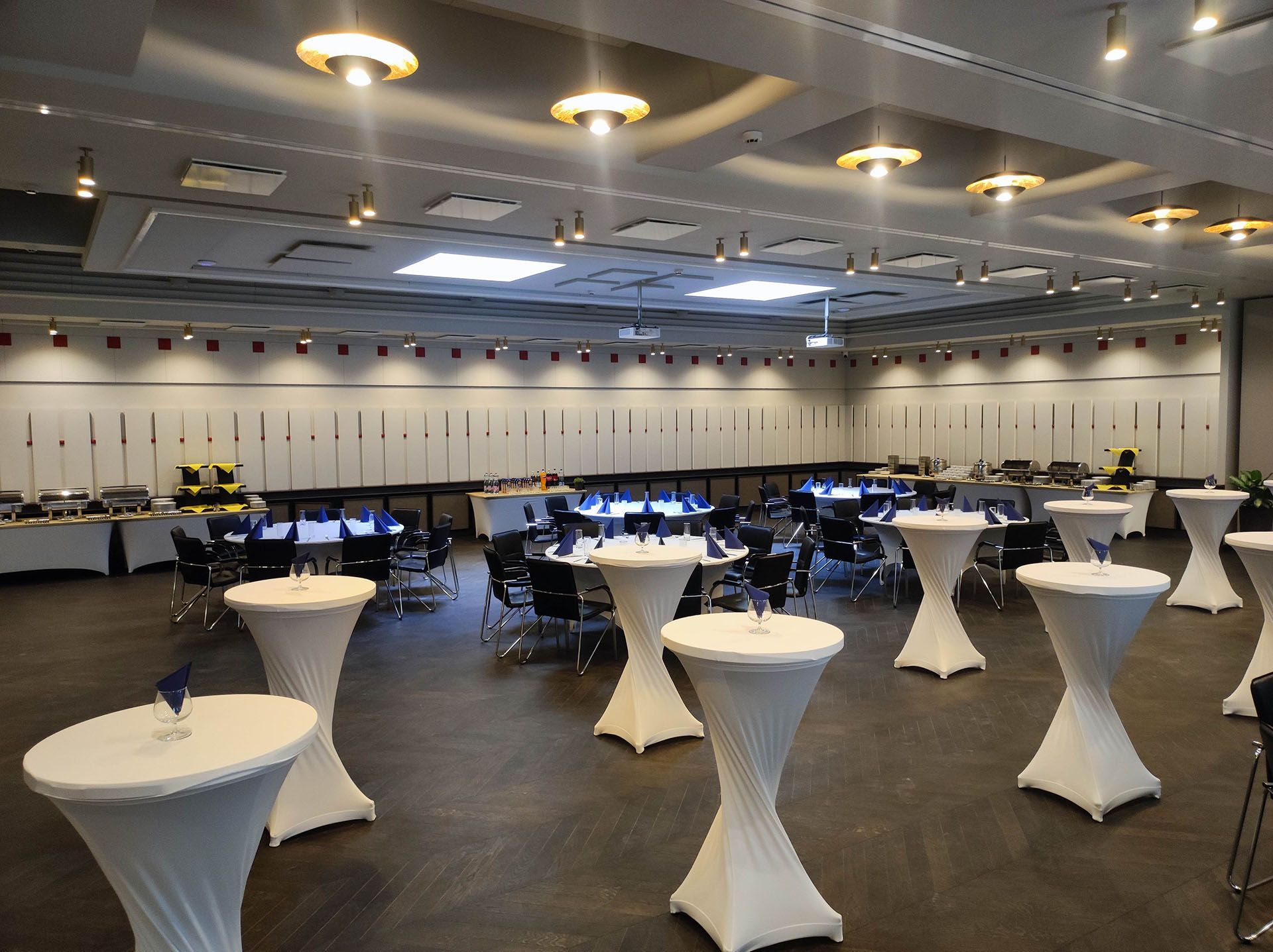The hall is accessed through a spacious, 136 sqm foyer featuring an elegant cloakroom and a stylish bar area, providing a welcoming atmosphere for arriving guests. The main space benefits from ample natural daylight and can be flexibly divided into two highly soundproofed sections of 150 m² each. One section can be further extended by an additional 40 m², allowing the layout to adapt seamlessly to various event formats.