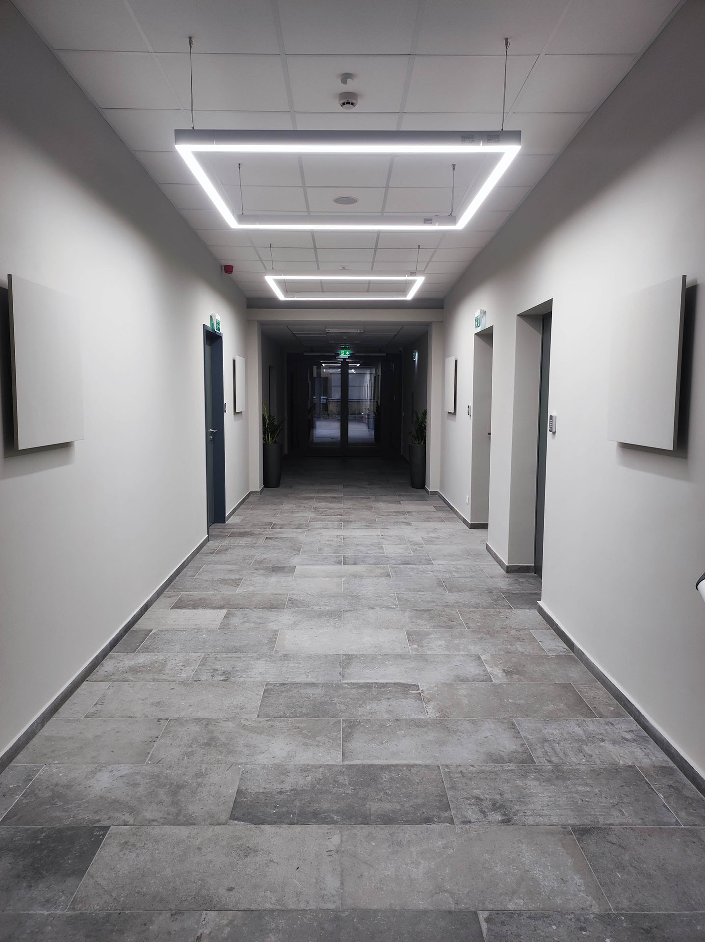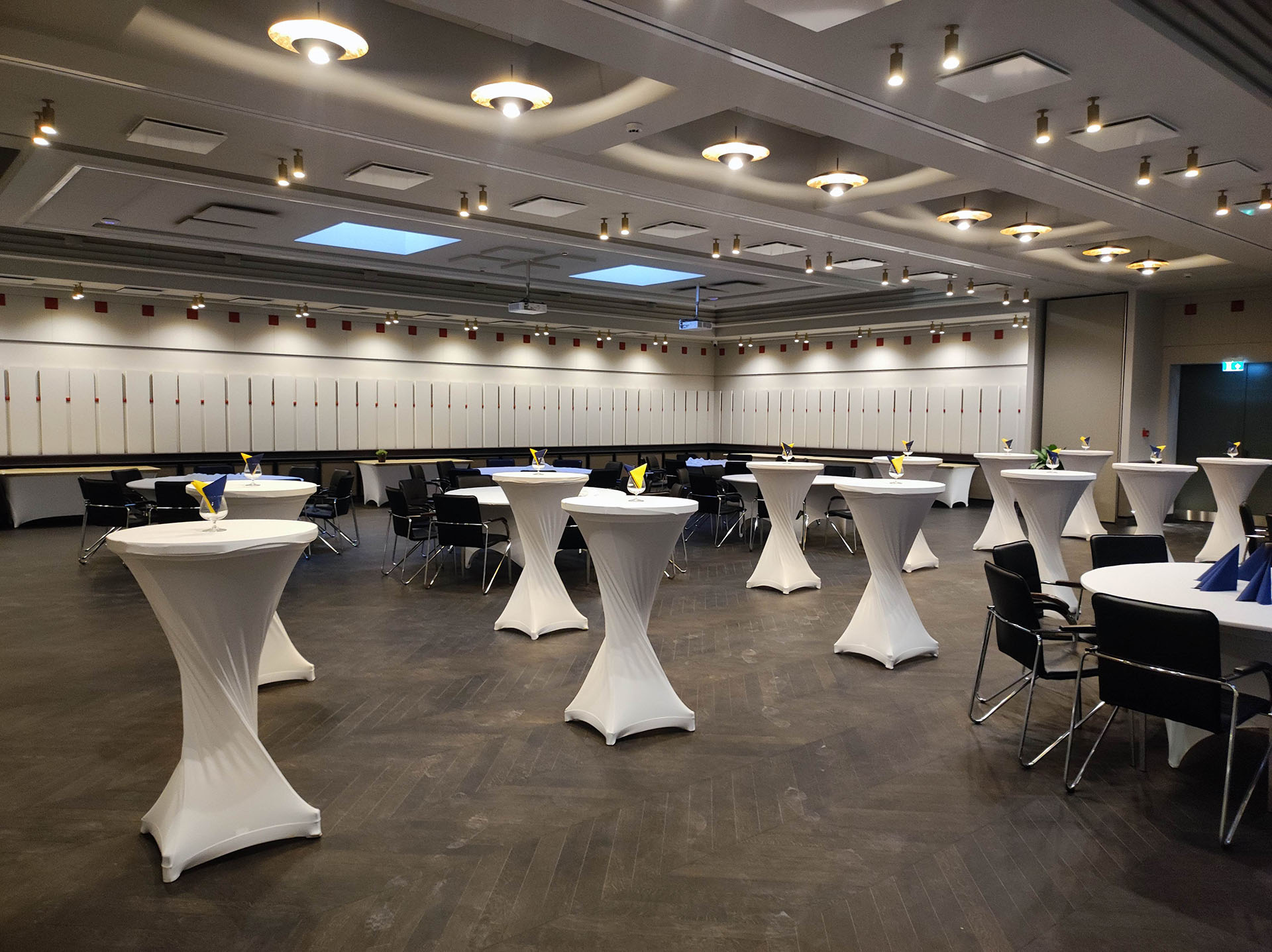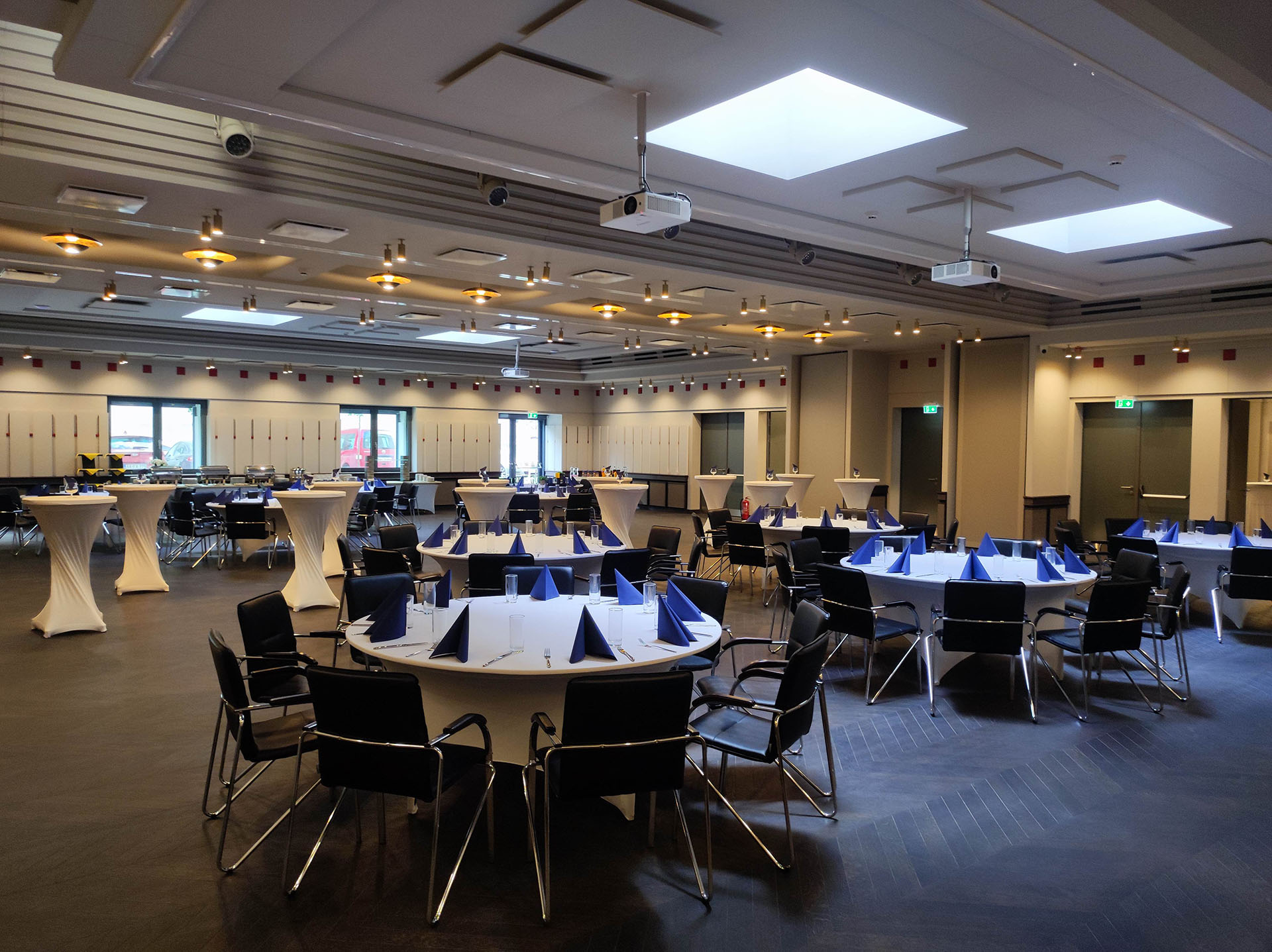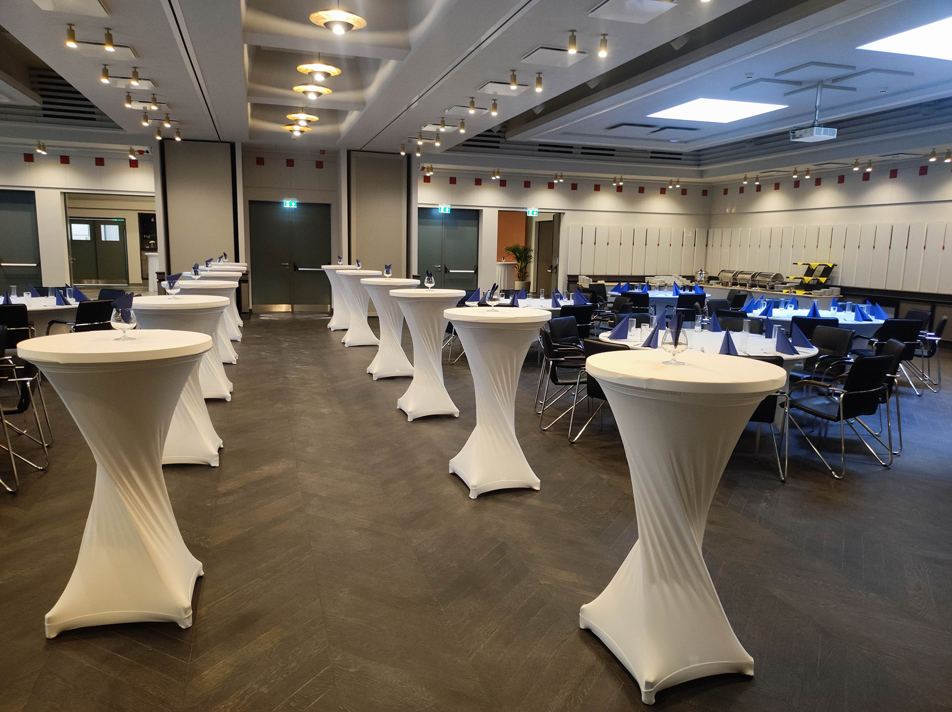 The hall is accessed through a spacious, 136 sqm foyer featuring an elegant cloakroom and a stylish bar area, providing a welcoming atmosphere for arriving guests. The main space benefits from ample natural daylight and can be flexibly divided into two highly soundproofed sections of 150 m² each. One section can be further extended by an additional 40 m², allowing the layout to adapt seamlessly to various event formats.